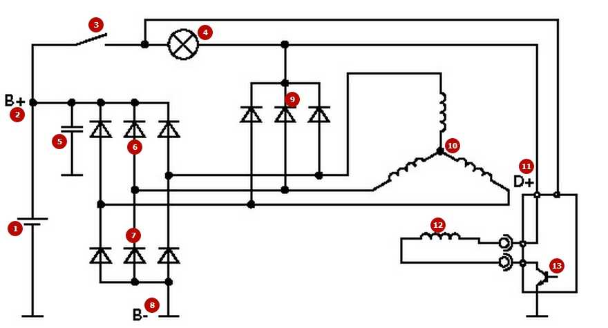 Принцип работы достаточно простой, при включении зажигания плюс через замок зажигания идет через блок предохранителей, лампочку, диодный мост и выходит через резистор на минус. Когда лампочка на приборной панели загорелась, далее плюс идет на генератор (на обмотку возбуждения), далее в процессе запуска двигателя шкив начинает вращаться, также вращается якорь, за счет электромагнитной индукции вырабатывается электродвижущая сила и появляется переменный ток.