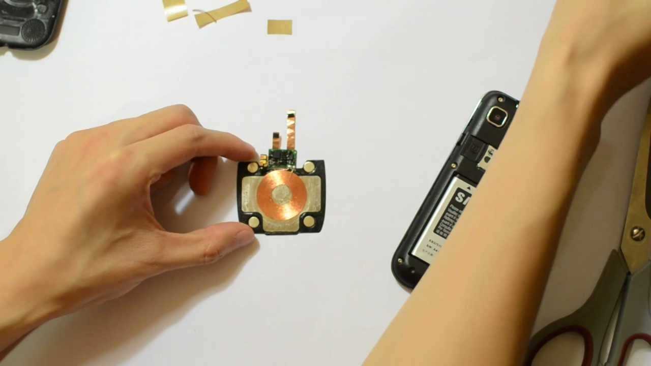 Далее наматывается 30 витков более тонкого медного проводника для передатчика. Для замыкания контура применяются транзистор и конденсатор. Положив устройство, оснащённое под крышкой приёмника, в зоне передающего кольца вверх дисплеем, можно добиться беспроводной зарядки телефона.