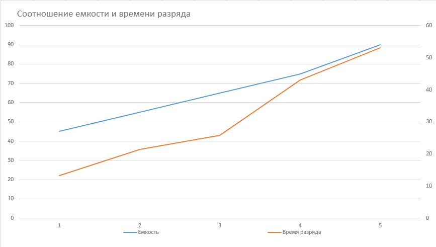 Причем это время вновь теоретическое, при таких нагрузках реальное падение емкости гораздо больше, так как химические реакции на поверхностях пластин замедляются – электролит рядом с ними теряет плотность быстрее, чем в общем объеме. Таким образом, можно логично заключить, что, чем больше номинальная емкость батареи, тем дольше она сможет работать именно при стартерной нагрузке. Особенно это критично для автомобилей, где из-за компоновочных соображений устанавливаются компактные аккумуляторы, имеющие небольшую емкость – тут установка AGM или гелевой батареи, имеющих более высокую удельную емкость, сможет стать решением многих зимних проблем. Зависимость времени разряда при высоких нагрузках и номинальной емкости нелинейна, что демонстрирует график: