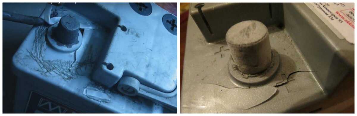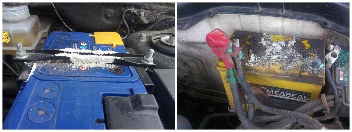 подтеки электролита из-за повышенного уровня в отсеках АКБ или механического повреждения корпуса. Для удаления подтеков используется раствор щелочи. Наиболее доступным вариантом является смесь чайной ложечки соды с одним стаканом воды;