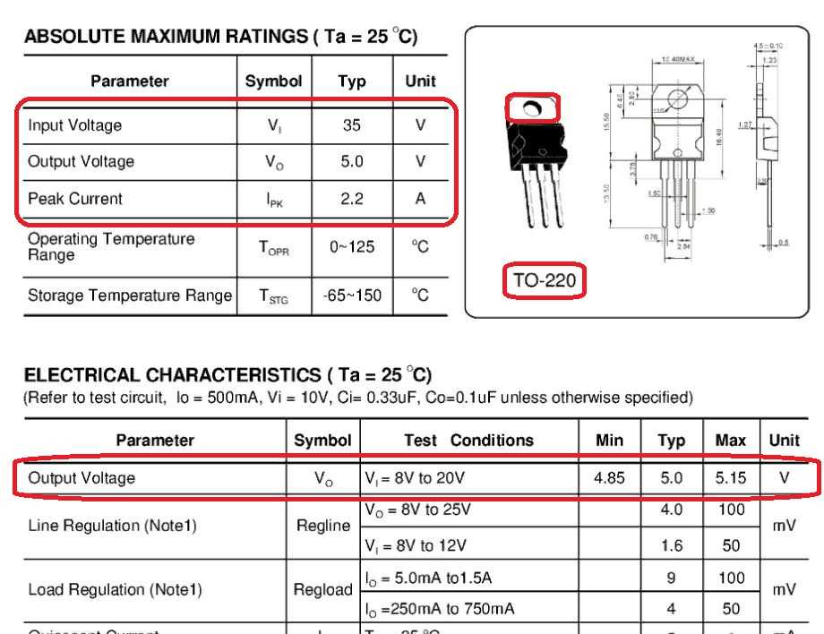Тест проведен на примере LM7805. Из даташита видно, что максимальное входное напряжение (V1), которое можно подать на этот стабилизатор, составляет 35 В. При этом выходной вольтаж (V0) должен ровняться 5 вольт, а пиковый ток Ipk может достигать 2,2 ампер (не путать с максимальным действующим). Ниже описан более подробный тест. При входном напряжении от 8 до 20 В, выходное должно лежать в диапазоне от 4,85 до 5,15 В. Если тестируемый стабилизатор не удовлетворяет этим характеристикам, то он считается неисправным.