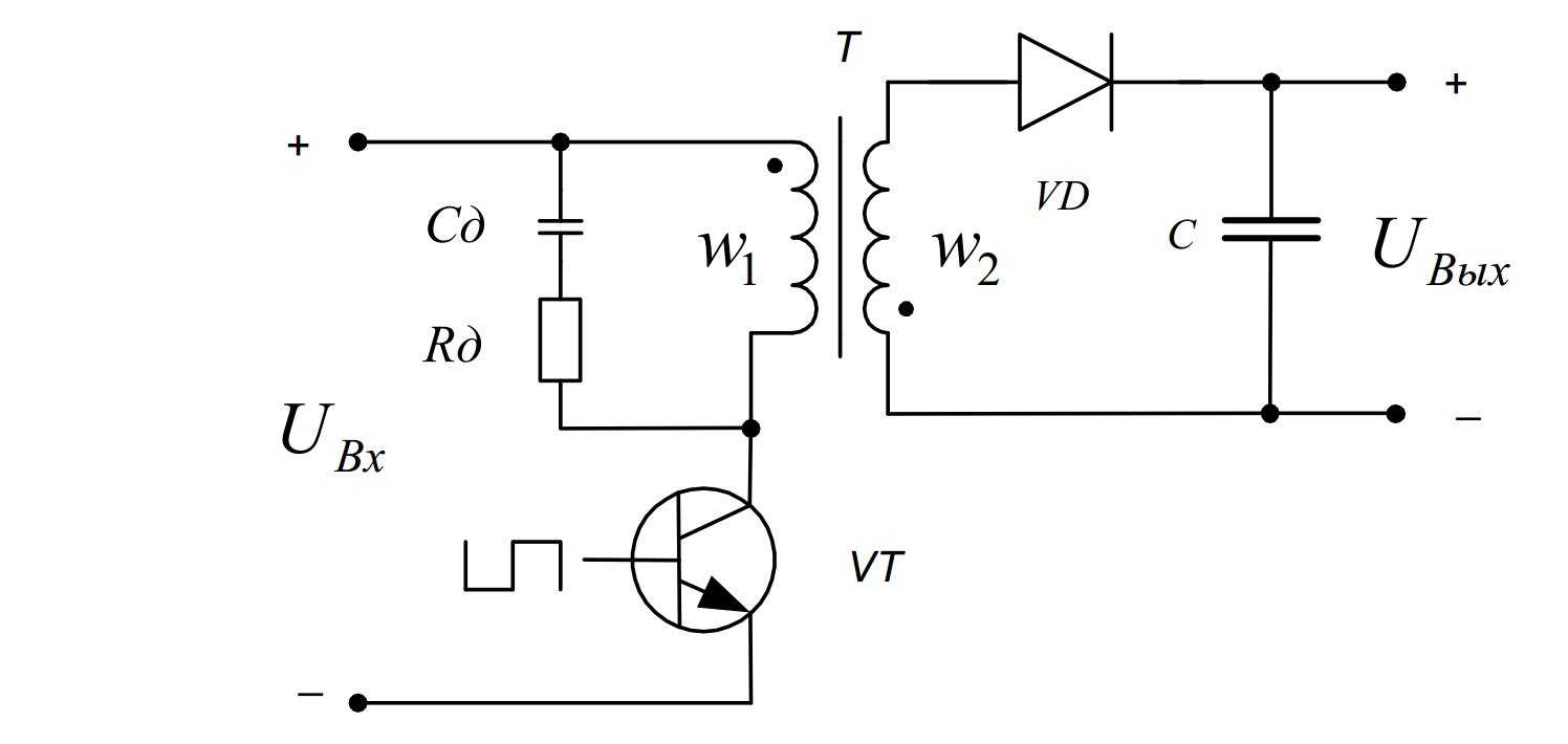 В момент когда транзистор закрывается трансформатор своей индуктивностью может вызвать на коллекторе высоковольтный скачок или всплеск, что несомненно, очень плохо и может привести к пробою полупроводникового элемента. Для этого и устанавливается RC-цепочка из конденсатора и катушки индуктивности, которая может быть подключена параллельно ключу или первичной обмотке. Такой обратноходовой импульсный преобразователь широко используется во многих сетевых источниках электрического тока с небольшой мощностью порядка 100 Вт.