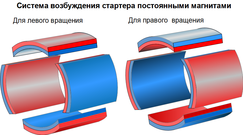 Для стартеров с магнитной системой возбуждения направление вращения определяется только расположением магнитов в корпусе.