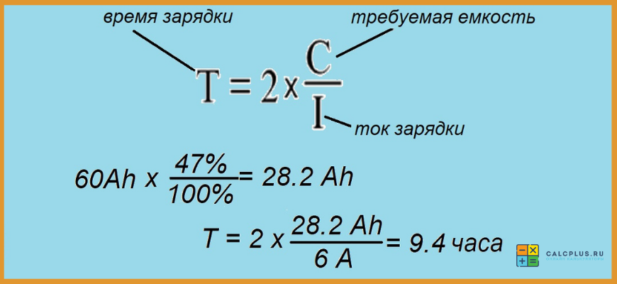Следующий шаг — определение потерянной емкости в Ач. Рассмотрим на примере: 60 (емкость АКБ)*47/100=28,2Ач. Дальше рассчитаем время зарядки АКБ по такой формуле Т=2*С/І, где Т — время зарядки, С — потерянная емкость, І — ток зарядки 2 — КПД заряда составляет 45-50%, поэтому умножаем на 2.