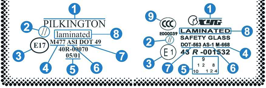 Производители автостекол чаще всего используют два вида маркировок — американский (другое название — «жук») и европейский. Хоть эти два стандарта и отличаются между собой, но есть и схожие параметры.