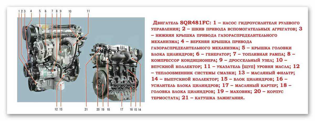 Спустя пять лет после появления двигателя 481FC производитель решился на выпуск нового силового агрегата – SQR481FC. Объем этой установки как и прежде составляет 1845 куб.см. Без изменений осталась и потенциальная мощность – 132 лошадиные силы. При 4700 оборотах в минуту движок производит 170 Нм крутящего момента. В целом, многие динамические и эксплуатационные характеристики остались неизменными или близкими к тем, каким способен похвастаться мотор 481FC. Основная слабость мотора – неустойчивость перед критическим повышением температуры