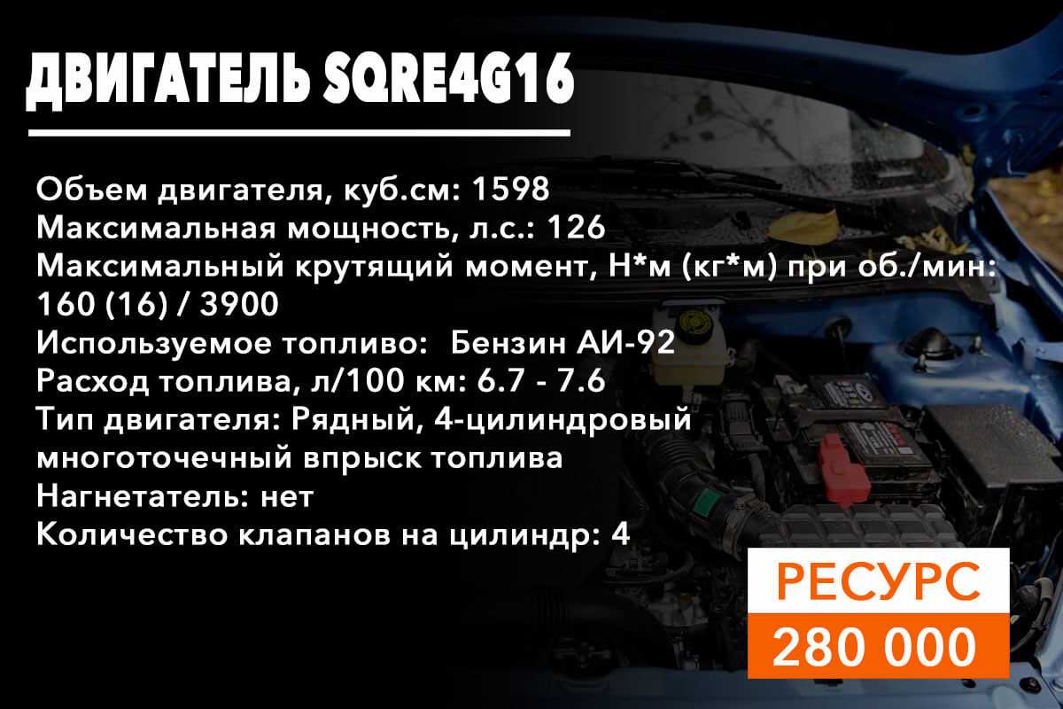 Мотор работает под управлением электронного блока управления Bosh ME7.8.8, который запрограммирован под стандарты Евро 4-5. Приводом газораспределительного механизма выступает цепь, рассчитанная на весь эксплуатационный период установки. Другое дело, что хватает её максимум на 100-120 тысяч километров, после чего потребуется замена цепи ГРМ. Вместе с цепью нужно менять звездочку, «башмак», успокоитель и натяжитель. Поршневая группа выполнена довольно качественно: в ходе её изготовления применили алюминий для выплавки поршней и чугун для шатунов. Доказательством технологичности двигателя является его оптимизированная конструкция, способствующая максимально эффективному сгоранию топлива в камерах, следовательно, высочайшему уровню полезности при минимальном расходе топлива. Что касается ресурса двигателя SQRE4G16, то автовладельцу лучше всего рассчитывать на 280 000 километров пробега.