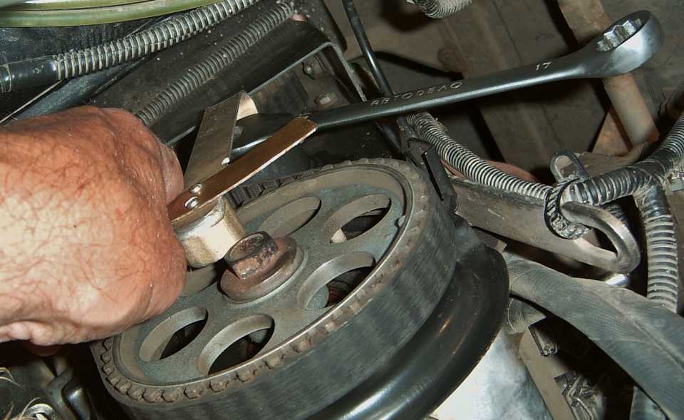 3. Делается это так, шкив совмещается с отверстием для датчика коленвала и через отверстие под датчик, вставляется подходящего размера трубка или другой подходящий предмет, в моем случае это шестигранник, шкив блокируется, а затем откручивается и снимается.