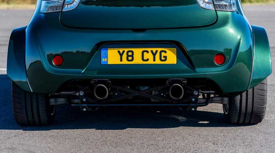Для проекта был взят обычный кузов Cygnet, в который был интегрирован трубчатый каркас безопасности. Чтобы установить большой двигатель, усилили каркас моторного отсека и изменили тоннель трансмиссии. Топливный бак пришлось размещать в багажнике.