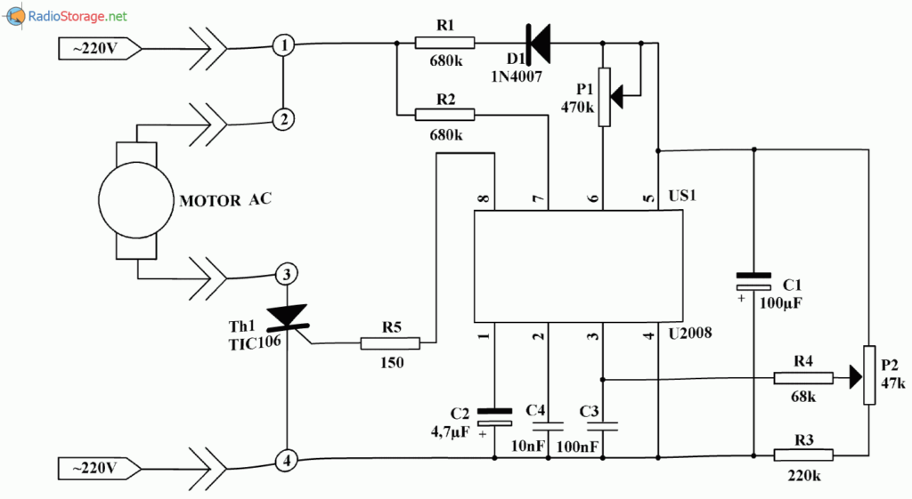 Схема 1 — Тиристорная регулировка оборотов коллекторного двигателя без потери мощности.