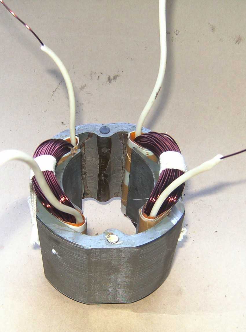 - Статор. Такая деталь может включать в себя не один магнит, а, к примеру, две пары полюсов. Вместе с этим на месте статических магнитов здесь будут находиться катушки электромагнитов. Совершать работу такое устройство способно как от постоянного тока, так и от переменного.