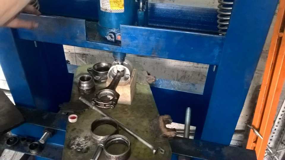 Старый комплект порншей на шатунах был слегка отмыт (шатуны капитально отстираны). Далее, привезли весь хлам на СТО к другу на пресс.