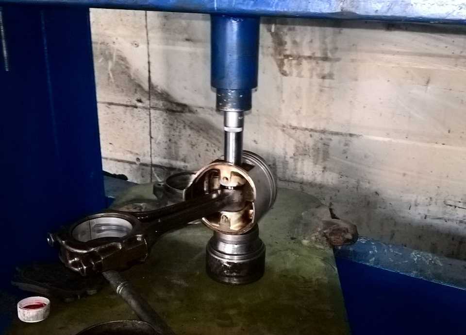 Технология такая (взято из мануала + здесь на Д2 пост ( www.drive2.ru/l/3718224/ )+ еще где то.): осторожно греем горелкой шатун возле пальца, основательно — но не до красна естественно, ставим на пресс и выдавливаем головкой палец к ебеням