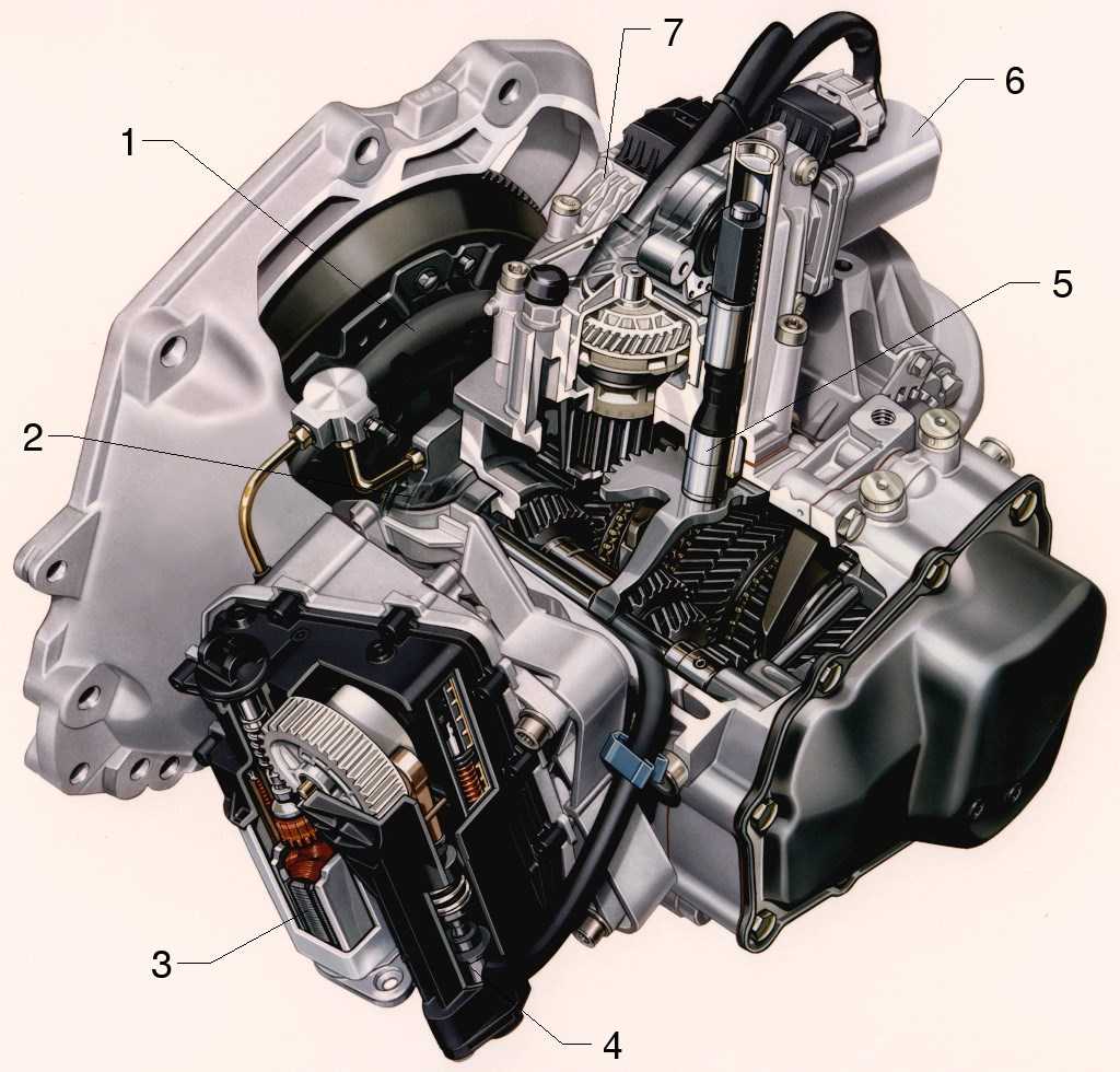 цилиндр сцепления (CSC), 3 — электродвигатель (постоянного тока) — управляет сцеплением, 4 — поршень (внутри цилиндра), 5 — механизм