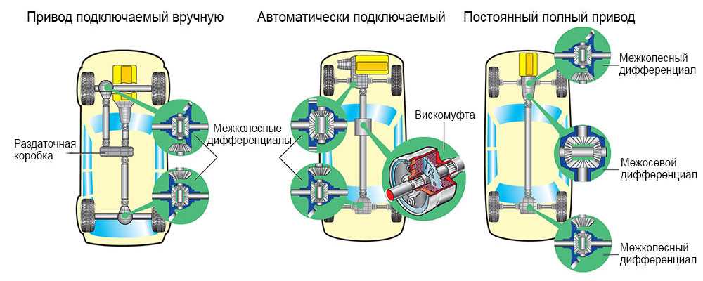 На автомобилях нашли применение три вида полного привода, отличающиеся между собой как конструктивно, так и по особенностям работы: