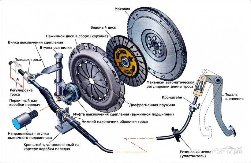 получает рабочий цилиндр, воздействующий на выжимной подшипник. Когда водитель