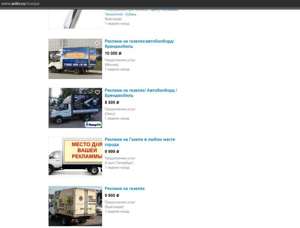 После этого случая я начал зондировать почву на предмет размещения рекламы на прикрепленных к одному месту стационарных Газелях. Меня интересовало: будут ли клиенты, стоит ли вкладывать деньги в это дело. Для этого я сфотографировал чужую Газель с рекламой и выдал ее за свою в объявлении на Авито.