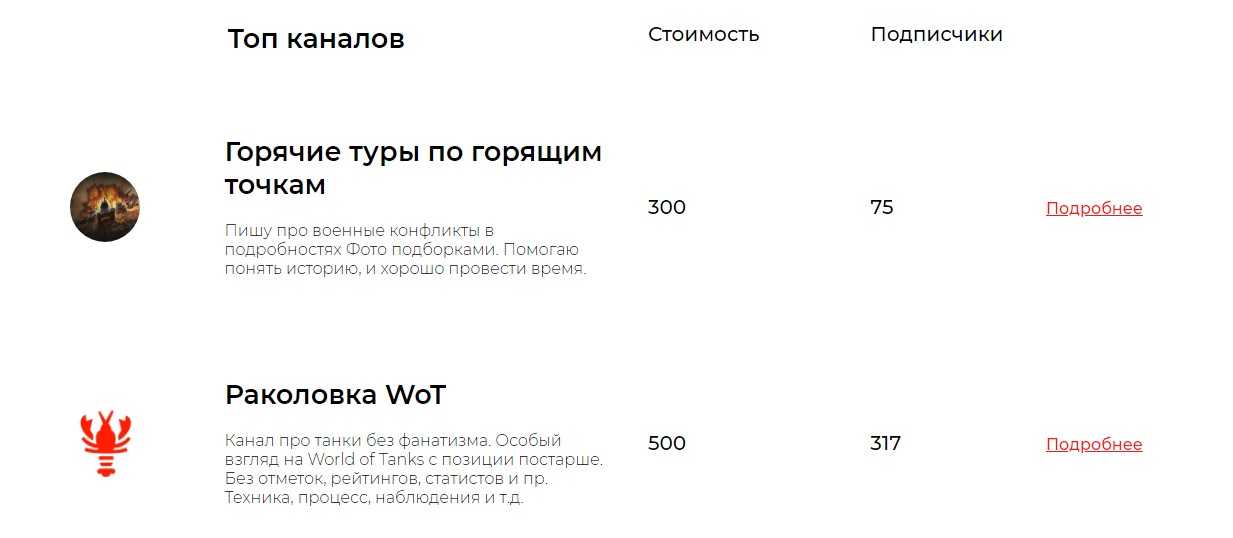 - Рекламодатели сразу видят много каналов, число подписчиков, стоимость и контакты.