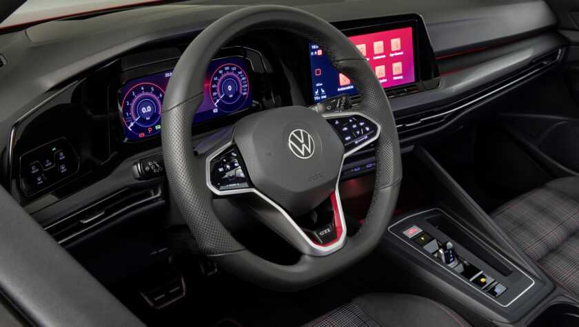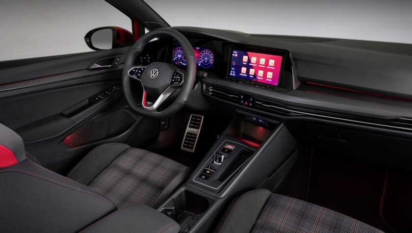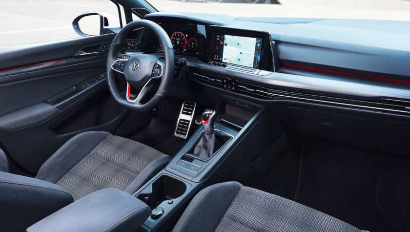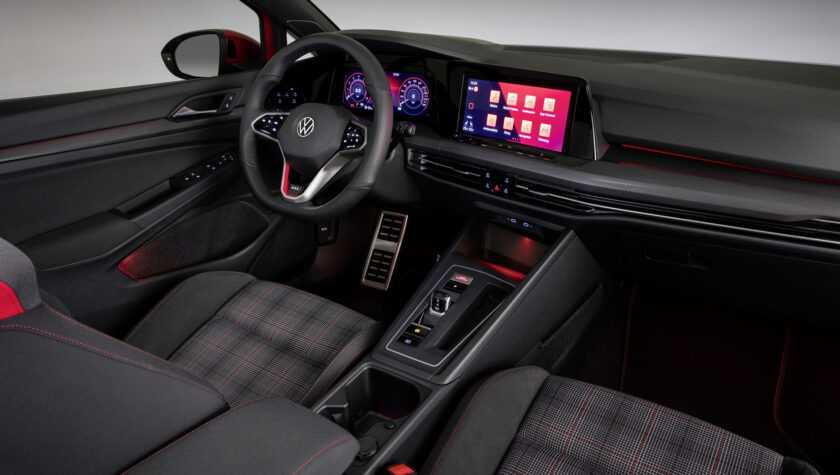 Интерьер GTI-версии Гольфа 2021 года порадует консерваторов сдержанным стильным оформлением торпедо, сидений и центральной панели. Взгляд сразу же останавливается на:
