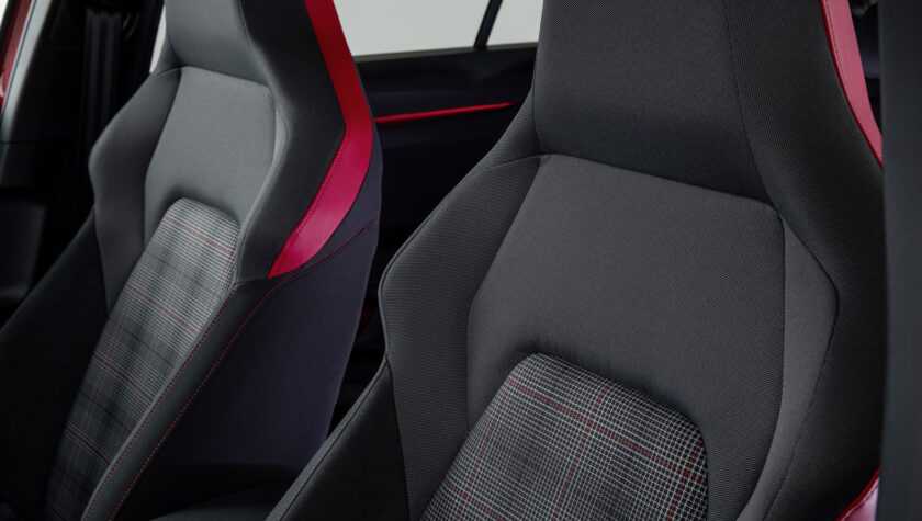 Снаружи версия GTI выделяется другой решеткой радиатора с традиционным красным обрамлением. Спортивные сиденья обиты тканью в клетчатый рисунок. Это красивая отсылка к традиции первого поколения. Те, кто хотел кожаные сиденья, могли за дополнительную плату выбрать черный или бежевый оттенок.