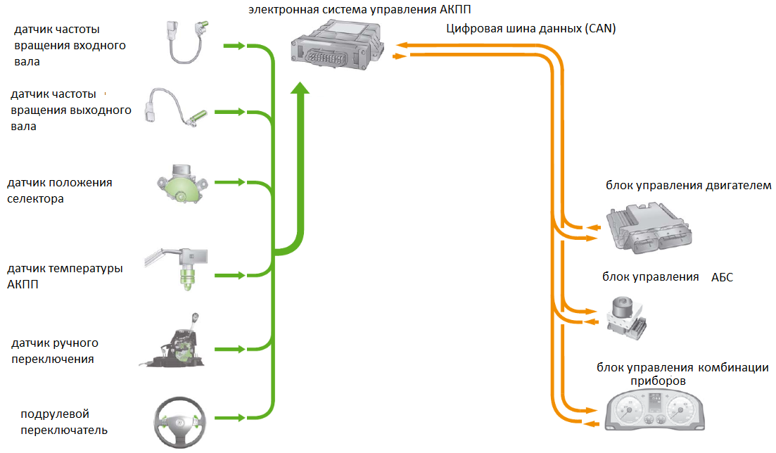 Входные и выходные сигналы блока управления АТ 722.6 и шина обмена данными CAN