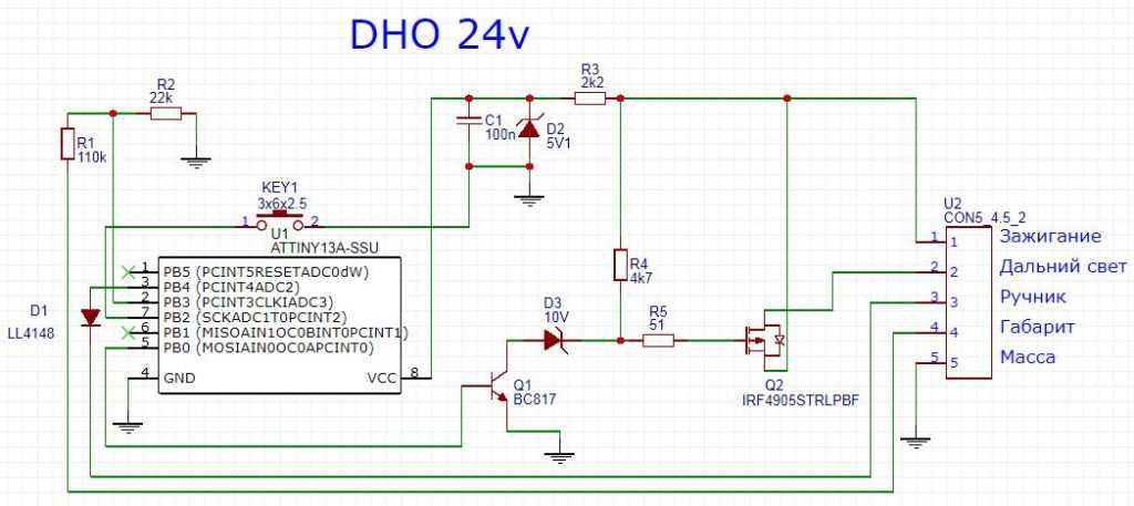 В интернете много схем и устройств ДХО дальний свет в полнакала на 12 вольт, а на 24 вольта мало, и в основном они сложные. Ниже рассмотрим контроллер дхо дальний в полнакала, будут предоставлены схемы на 12 и 24 вольта. А управлять будет недорогой и доступный конроллер Attiny13A.