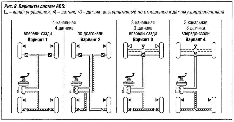 4-канальные системы ABS с 4 датчиками (рис. «Варианты систем ABS» ) позволяют индивидуально регулировать тормозное давление на каждом колесе по четырем гидравлическим каналам, с разделением тормозных контуров между передними и задними колесами (для ll-образной конфигурации тормозных контуров) или диагональным распределением (для Х-образной конфигурации тормозных контуров). У каждого колеса есть свой датчик, измеряющий угловую скорость.