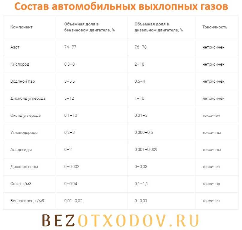 Состав выхлопных газов автомобилей зависит от качества используемого топлива и типа двигателя. Но отличия будут только в процентном составе тех или иных веществ. Выхлопы автомобилей состоят как из вполне безвредных веществ, так и из достаточно токсичных.