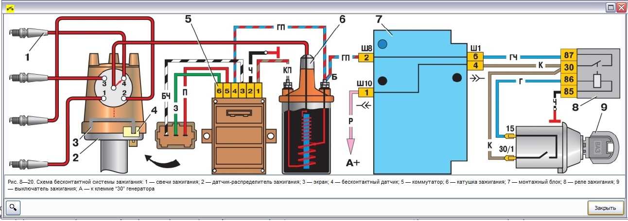А также самодельные варианты схемы электронного зажигания Система зажигания ВАЗ 1 — генератор; 3 — распределитель зажигания; 2 — выключатель зажигания; 5 — свечи зажигания; 4 — кулачок прерывателя; 6 — катушка зажигания; 7 — батарея аккумуляторов на 12 вольт Схема классической контактной системы зажигания КСЗ для различных моделей ВАЗ 1 — свечи; 2 — распределитель; 3 — конденсатор; 4 — кулачок прерывателя; 5 — катушка; 6 — блок монтажный; 7 — реле; 8 — выключатель; А — к клемме «30» генератора Схема бесконтактной системы зажигания БСЗ ВАЗ 1 — свечи; 2 — датчик-распределитель; 3 — экран; 4 — датчик бесконтактный; 5 — коммутатор; 6 — катушка зажигания; 7 — блок монтажный; 8 — реле; 9 — выключатель; А — к тридцатой клемме генератора.