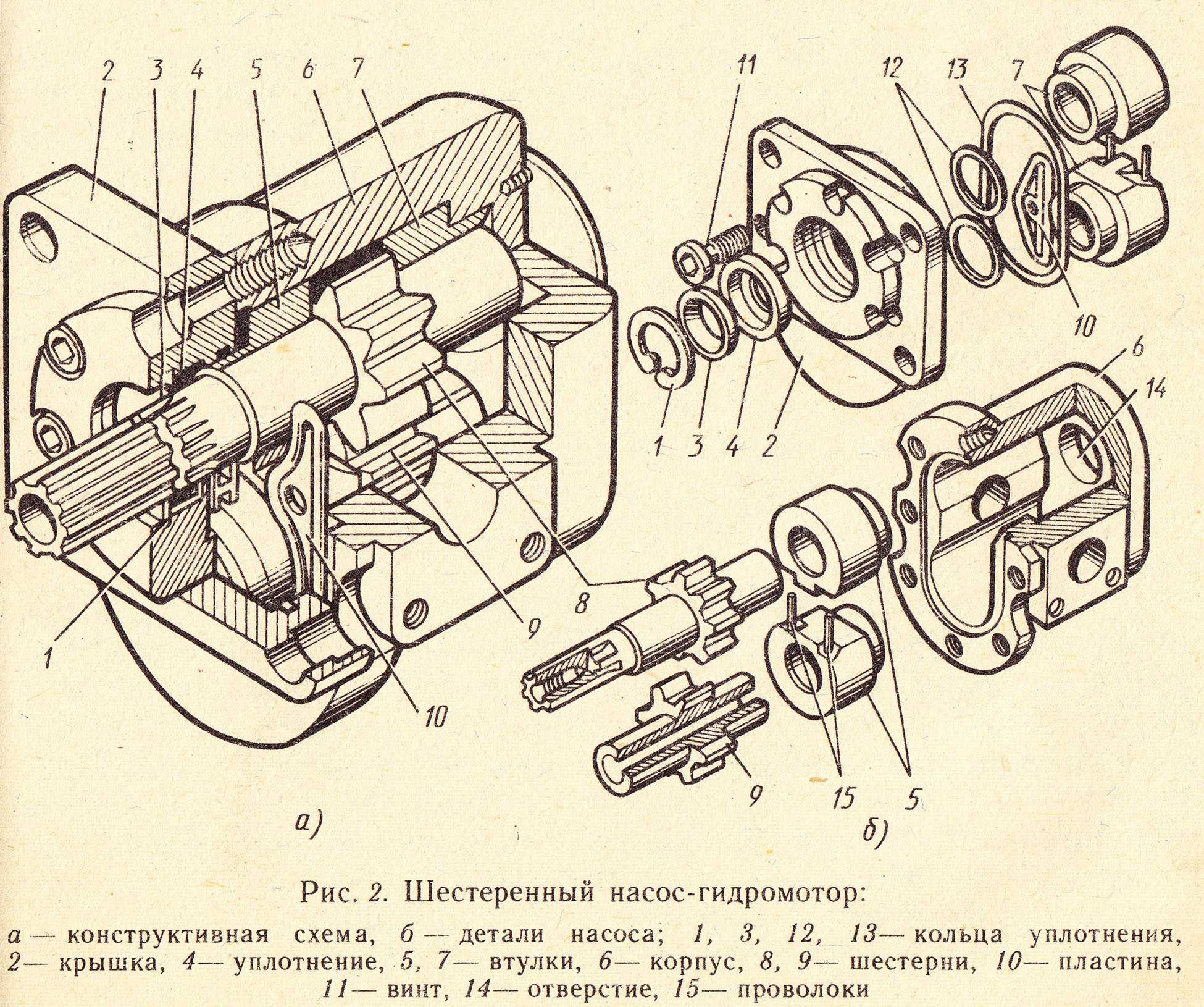 Основное условие нормальной работы любой гидравлической техники – это достаточный уровень давления жидкости внутри системы. Для того, чтобы более подробно рассмотреть возможные варианты неисправностей аппаратов, нужно четко понимать схематическую конструкцию напорной шестеренчатой техники. Состоит шестеренный агрегат из: