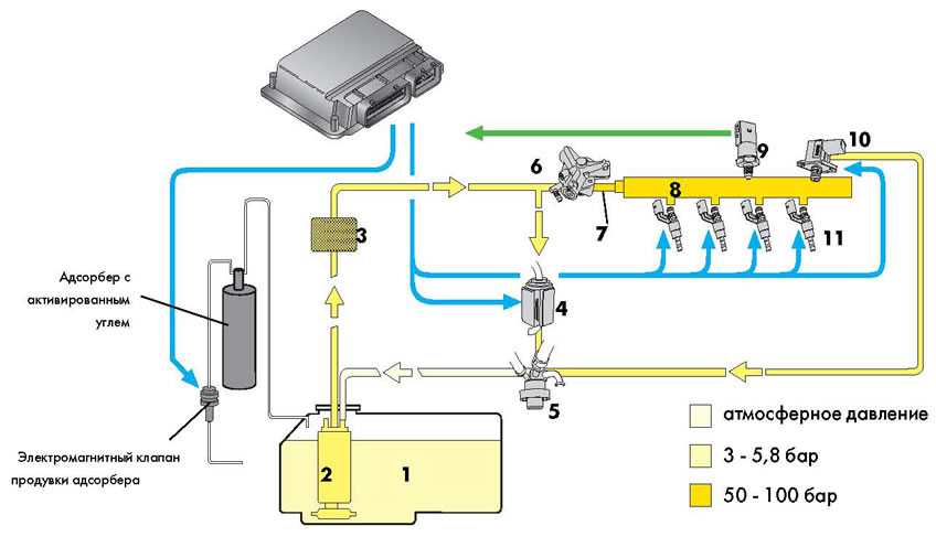 В контур низкого давления входят: 1. топливный бак 2. топливный электронасос 3. топливный фильтр 4. клапан перепуска топлива 5. регулятор давления топливаВ контур высокого давления входят: 6. топливный насос высокого давления 7. трубопровода высокого давления 8. распределительный трубопровод 9. датчик давления топлива 10. клапан регулятора давления 11. форсунки высокого давления