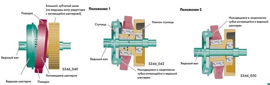 3. Редуктор с подвижной шестерней. Посредством зубчатого ремня крутящий момент от электродвигателя передается на большой зубчатый шкив. Поводки подвижной шестерни препятствуют ее повороту относительно корпуса, поэтому она лишь может качаться на оси ступицы большого зубчатого шкива. Ведомая шестерня и ведомый вал жестко связаны между собой. Ведущая шестерня на валу размещена на подшипнике.