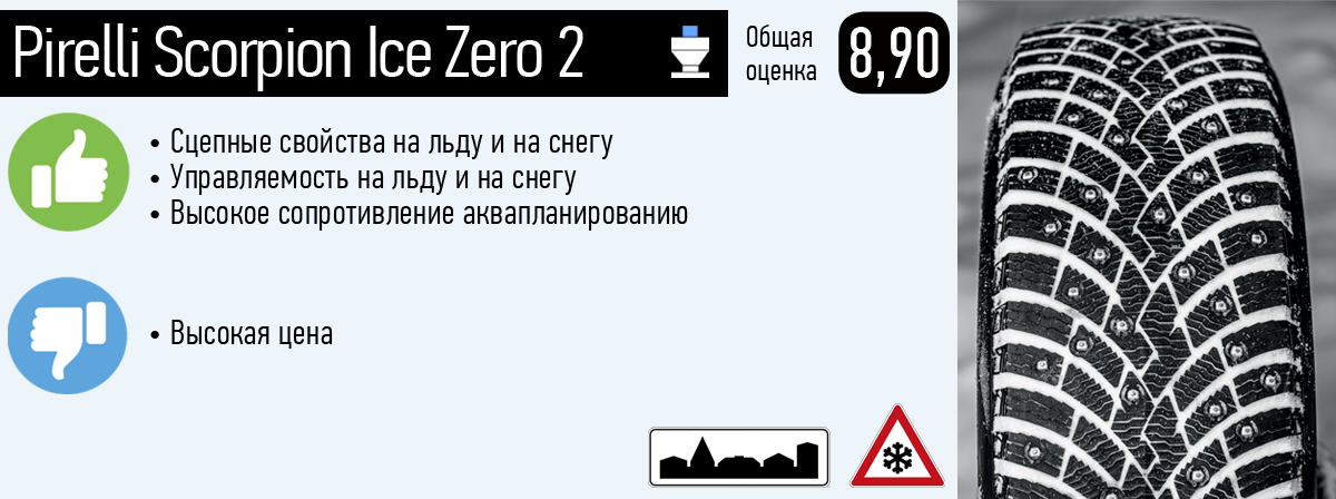 Новые шины Pirelli Scorpion Ice Zero 2 уже вошли в историю как первые шиповки, омологированные для суперкроссовера Lamborghini Urus. А теперь и в нашем тесте вышли на второе место. Мощные фигурные шипы обеспечивают хорошие сцепные свойства на льду, хотя шум от них умеренный. Сопротивление аквапланированию — лучшее среди испытанных нами шипованных покрышек. Так что шины Pirelli Scorpion Ice Zero 2 подойдут не только для загородных дорог, но и для городской зимней эксплуатации.