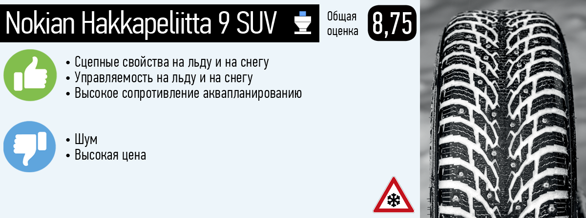 Даже с уменьшенным количеством шипов покрышки Nokian Hakkapeliitta 9 SUV демонстрируют отменные сцепные свойства на льду. А на трассе управляемости они и вовсе самые быстрые! Шипов немного, но они двух видов и в плечевой зоне заточены на упор в поворотах. На снегу тоже все неплохо, хотя в рыхлом пухляке, где шипы практически не работают, новые модели конкурентов предпочтительнее.