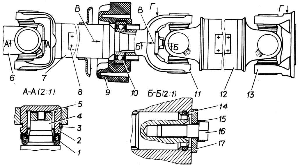 Рис. 5.28. Карданная передача с промежуточной опорой: Г — место допустимых ударов при сборке; 1 — манжета; 2 — игольчатый подшипник; 3 — стопорное кольцо; 4 — крестовина; 5 — торцевая шайба; 6 — скользящая вилка; 7 — масленка; 8 — балансировочная пластина; 9 — подушка опоры; 10 — подшипник промежуточной опоры; 11 — шлицевая вилка; 12 — задний карданный вал; 13 — фланцевая вилка; 14 — кольцо уплотнительное; 15 — стопорная пластина; 16 — болт; 17 — шайба |