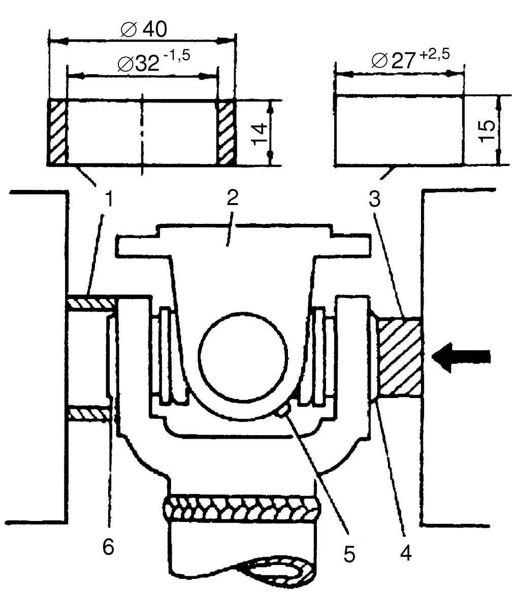 — поставить кольцо-оправку 1 на внешний торец ушка вилки с застопоренным подшипником (рис. 5.31 С) и допрессовать крестовину с подшипниками до упора стопорного кольца в подшипник и вилку, затем вставить второе стопорное кольцо;
