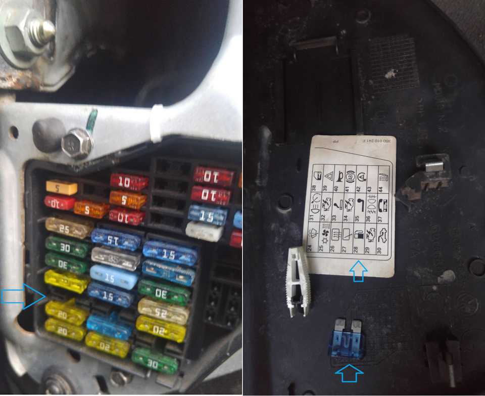 1. Вынимаем предохранитель №28, на 15 ампер у меня, синий, на фото указал стрелочкой место, пытаемся завести машину, чтоб стравить лишние топливо и в последующем его меньше вытечет.
