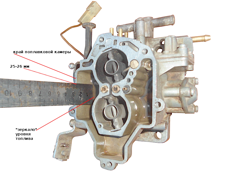 Уровень топлива измеряется обычной линейкой или штангенциркулем от края поплавковой камеры до границы зеркала бензина. Для карбюратора Солекс он составляет 25-26 мм.