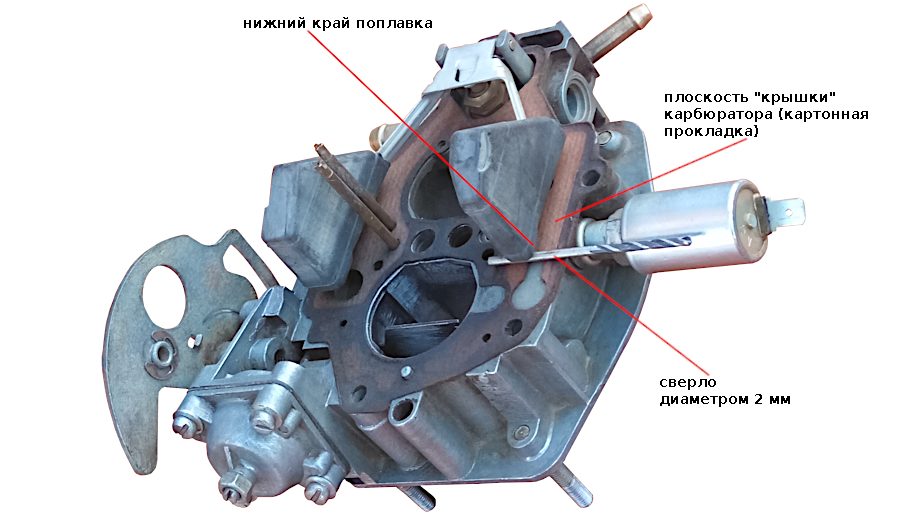 Для этого переворачиваем крышку карбюратора поплавками вверх и ставим ее на горизонтальную поверхность. Просовываем сверло диаметром 2 мм между выступом на нижней части поплавка и картонной прокладкой (она должна быть плотно прижата к крышке). Сверло должно входить с легким защемлением. Проводим проверку для второго поплавка. При уровне топлива 25-26 мм расстояние между поплавками и прокладкой должно составлять 2 мм. Это взаимозависимые величины. Если расстояние больше или меньше, то при помощи шлицевой отвертки и пассатижей немного подгибаем верхний язычок на рычагах поплавков. Проводим проверку еще раз.