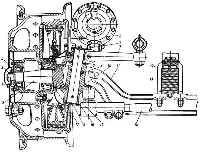 - отъединить поперечную рулевую тягу 14, расшплинтовать и отвернуть гайки и вынуть рычаг 7 поворотной цапфы;